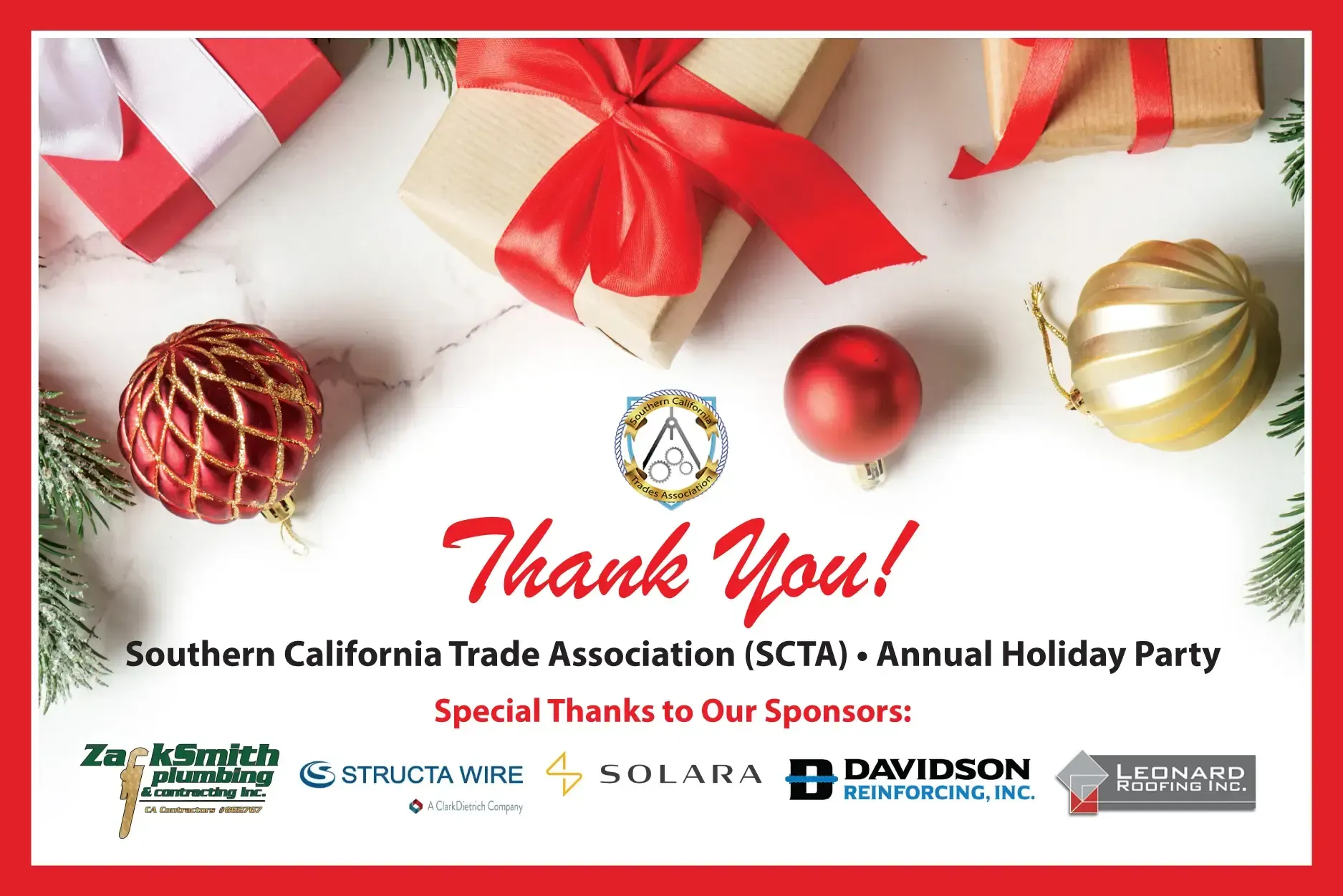Our SCTA Annual Holiday Party, held Tuesday, December 2nd at Stone Brewing World Bistro & Garden , was a festive success—bringing together members from across the association for an evening of great company, great food, and meaningful conversations. The turnout was fantastic, and the energy reflected the strength of the SCTA community. A Holiday Gift Exchange to Remember One of the highlights of the evening was once again our lively Gift Exchange. As always, it sparked plenty of laughter, friendly “gift stealing,” and good-natured competition as members tried their luck at holding onto their favorite finds. The Cohnac and the pies were unexpected crowd favorites—true holiday delicacies that added a delicious twist to the festivities. Thank You to Our Event Sponsors We extend our gratitude to this year’s holiday sponsors: Zack Smith Plumbing • Structa Wire • Solara • Leonard Roofing • Davidson Reinforcing Your support plays a vital role in the quality and impact of our events. Recognizing Our Holiday Events Committee A special acknowledgment to our dedicated SCTA Holiday Events Committee— Stacie Greene • Lola Wilson • Valerie Shultz • Brittany Ebner for their commitment and creativity in organizing a memorable celebration. Why SCTA Events Matter Whether it’s our monthly in-person meetings, our annual Meet the Trades , or the Holiday Party , SCTA gatherings do more than bring people together—they build real relationships. One powerful example: A member recently lost his job, and another SCTA member hired him. They later shared how well it was working out—proof that SCTA isn’t just an association; it’s a community that supports one another Join Us in 2026 We’re growing, and we want you to grow with us. Become involved. Join a committee. Attend our events. Share your ideas for expanding the SCTA in 2026. Together, we can strengthen our association and create more opportunities for our members. Happy Holidays from SCTA—and here’s to a prosperous New Year!