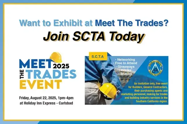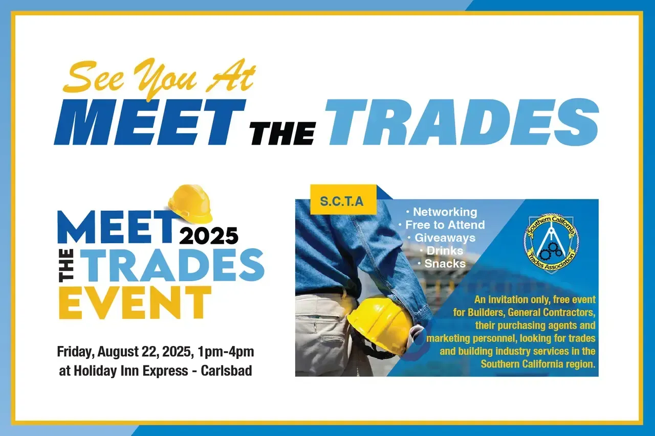 The countdown is on! Our highly anticipated annual SCTA Meet The Trades event is just around the corner —happening Friday, August 22nd, 2025 from 1:00 PM to 4:00 PM . This exclusive, invitation-only event is FREE for Builders , General Contractors , Purchasing Agents , and Marketing and HR Teams actively seeking new trade partners and building industry services in Southern California . Why Attend? You’ll have the unique opportunity to connect and collaborate with over 35 top-tier trades and service providers —all under one roof! Plumbers to Roofers Fire Sprinklers and Alarms Flooring, Cabinets, and Electrical Solar and Water Sub Meters Plumbing Fixers and Stucco Manufacturers Manufacturers of Welded Wire Stucco Reinforcing Products Marketing and Advertising Companies Insurance and Company Health Insurance Providers Geotechnical Engineering Firms Playground Equipment & Pool Installers Whether you’re aiming to expand your trade network, discover new vendors, or strengthen industry partnerships, this is the event you won’t want to miss. Explore our full SCTA Directory at: https://sctasd.org/ REGISTER TODAY Secure your spot now: https://www.eventcreate.com/e/2025-scta-meet-the-trades What to Expect: Engaging conversations with leading trade professionals Giveaways & Refreshments The SCTA Passport Challenge – Visit each trade table, collect stamps, and submit your completed passport to be entered into our Grand Prize Drawing! Thank You to Our Sponsors We’d like to extend a special thank you to our amazing sponsors who make this event possible: Mark your calendars: Friday, August 22nd, 2025 1:00 PM – 4:00 PM Holiday Inn Carlsbad 2725 Palomar Airport Road, Carlsbad, CA 92009 Register Now » We can’t wait to welcome you! Southern California Trades Association (SCTA) Connecting Builders to Trades that Build Our Future